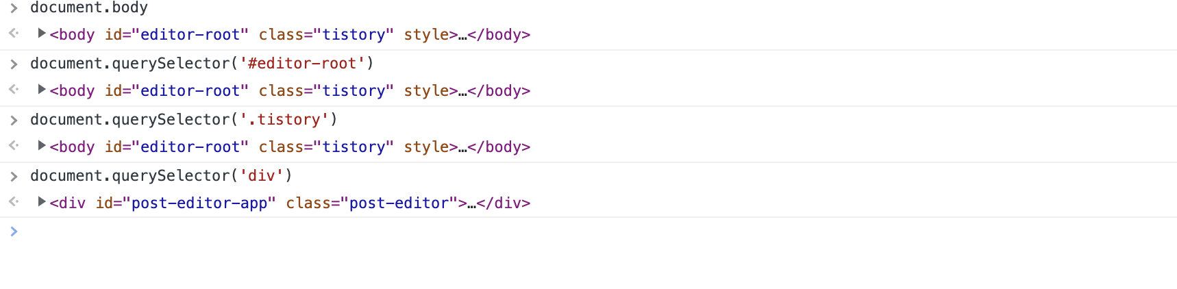 querySelector('셀렉터') 를 이용할 수 있는데, 셀렉터로는 HTML tag, id, class를 가장 많이 이용한다.