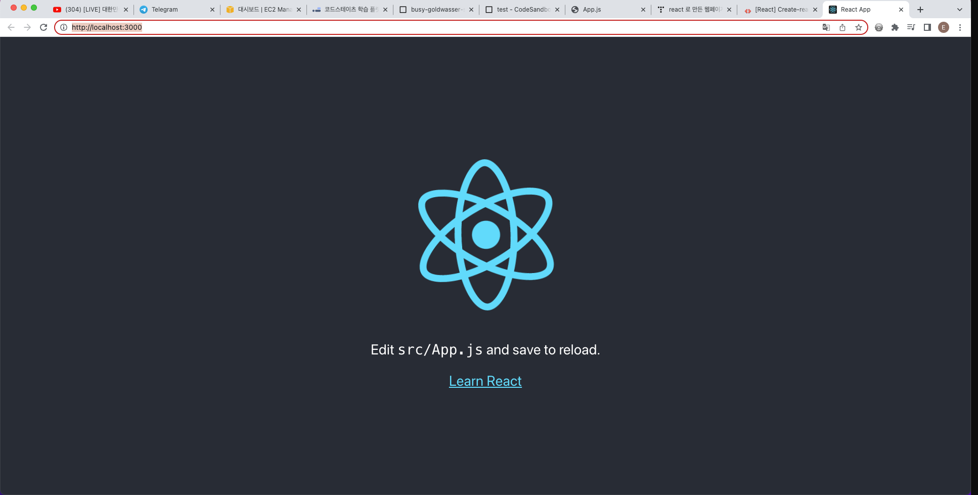 4. App.js 파일에 들어가 수정하고 save를 하면 자동으로 컴파일이 시작되어, 페이지가 자동으로 reload 되는 것도 확인할 수 있다.