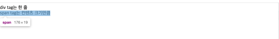 위 코드를 웹 페이지 상에서 확인해보면 div tag는 한 줄을 차지하지만, span tag는 컨텐츠 크기만큼만 공간을 차지하는 것을 확인할 수 있다.