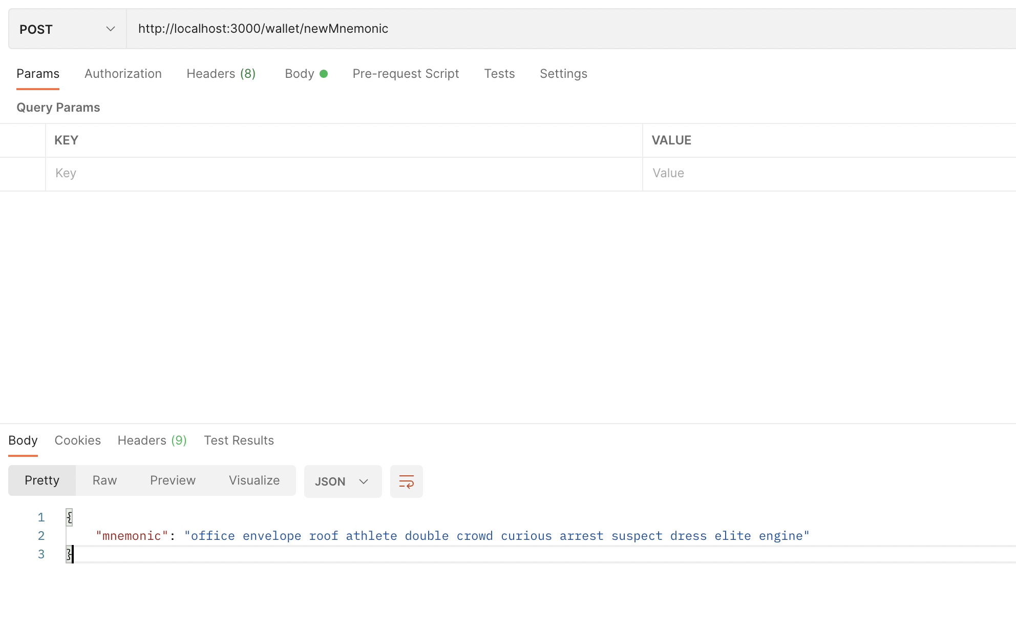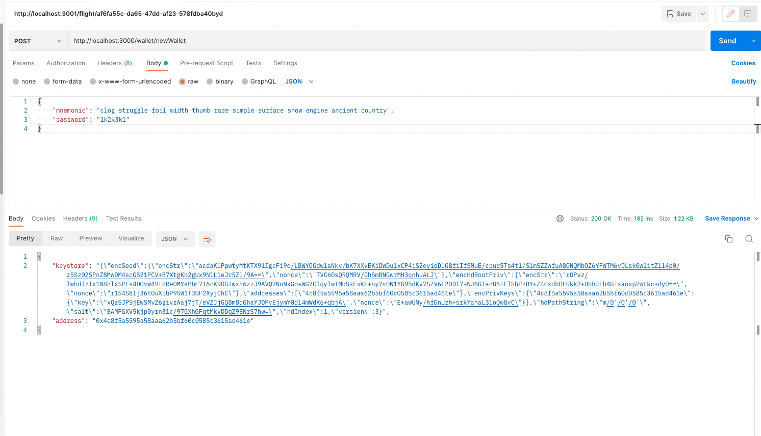 Postman을 이용해 keystore와 address의 응답 API를 테스트해볼 수 있다. 위에서 얻은 니모닉코드를 mnemonic이라는 키의 값으로 password에는 원하는 값을 넣은후 요청을 보내면 아래와 같이 응답하는 것을 확인할 수 있다.