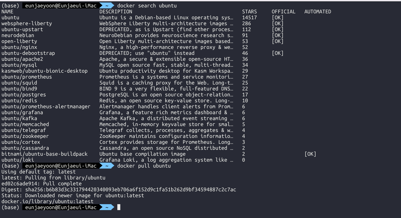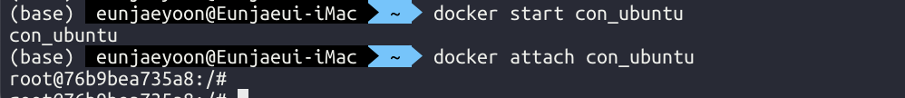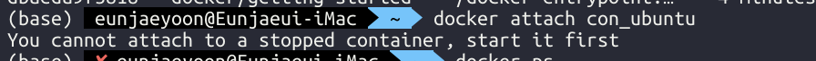 * 만약 이러한 에러 (You cannot attach to a stopped container, start it first) 가 발생한다면 컨테이너를 시작해주지 않아 발생한거니 docker start con_ubuntu 이 명령어로 생성한 컨테이너를 실행시켜주면 된다.