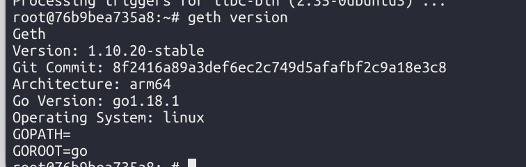 7. 위 명령어들을 차례대로 입력하고 설치가 완료됐다면 설치한 geth 의 버전을 확인한다.