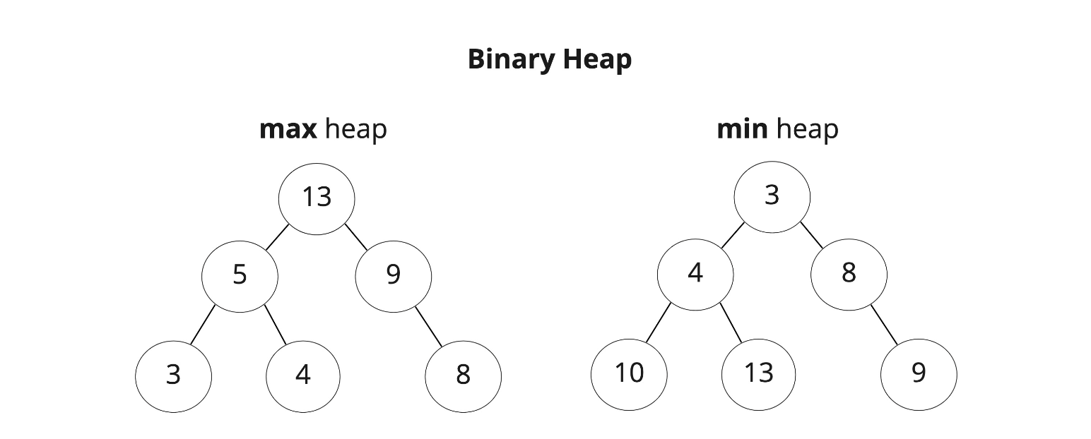 이진 힙은 힙 중에서 가장 널리 쓰이는 형태 중 하나로 이진 트리 형태인 힙이다. 이진 트리는 각 노드의 자식 노드가 반드시 2개 이하인 트리이다. 이진 힙은 완전 이진 트리라는 조건을 만족해야한다. 모든 레벨의 노드가 채워져 있어야 하며, 마지막 레벨은 왼쪽부터 차 있어야 한다. 이진 힙은 부모 노드 값이 자식 노드 값보다 크냐 작냐에 따라 최대 힙, 최소 힙으로 나뉜다.