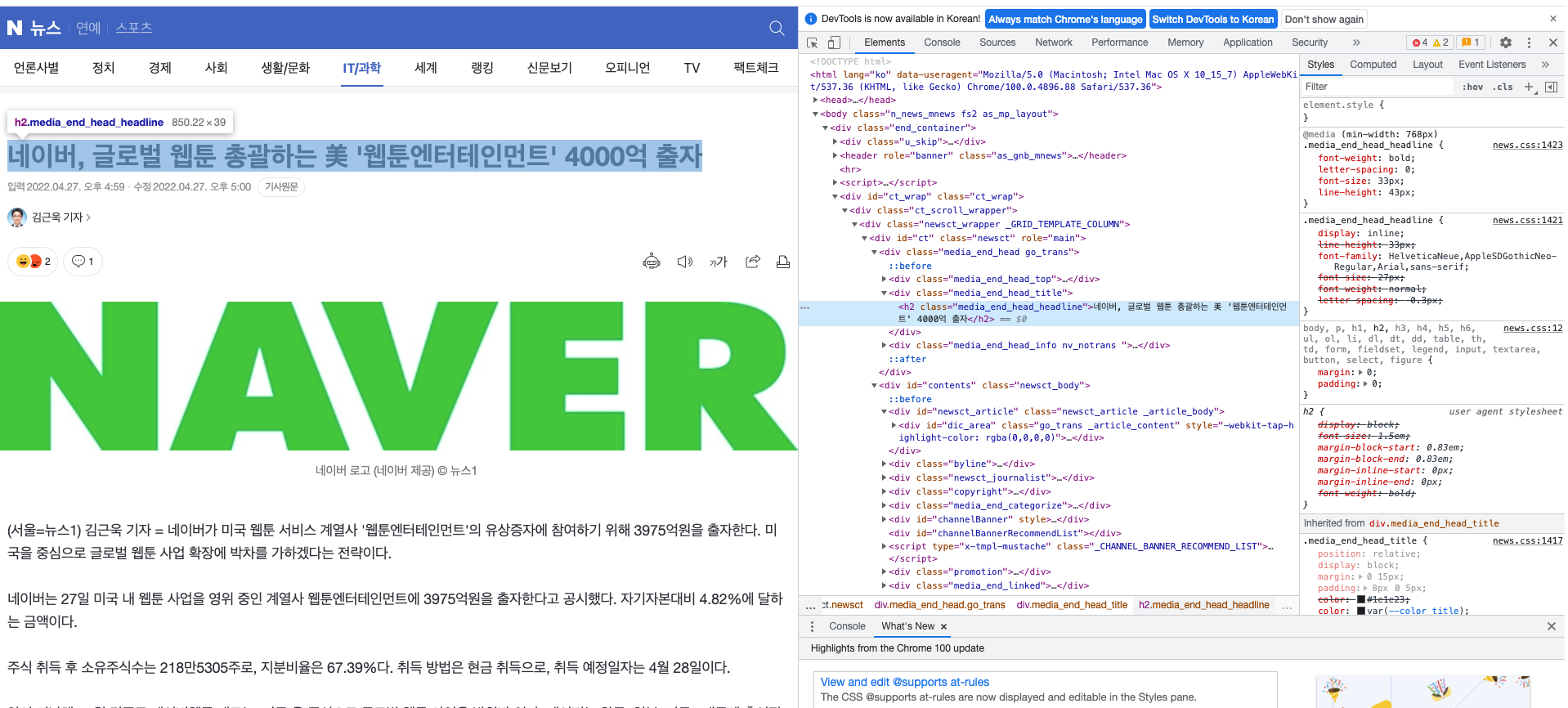 제목의 class 이름을 먼저 확인해보자. 이 기사의 경우에는 class 이름이 "media_end_head_headline" 으로 설정되어 있다.