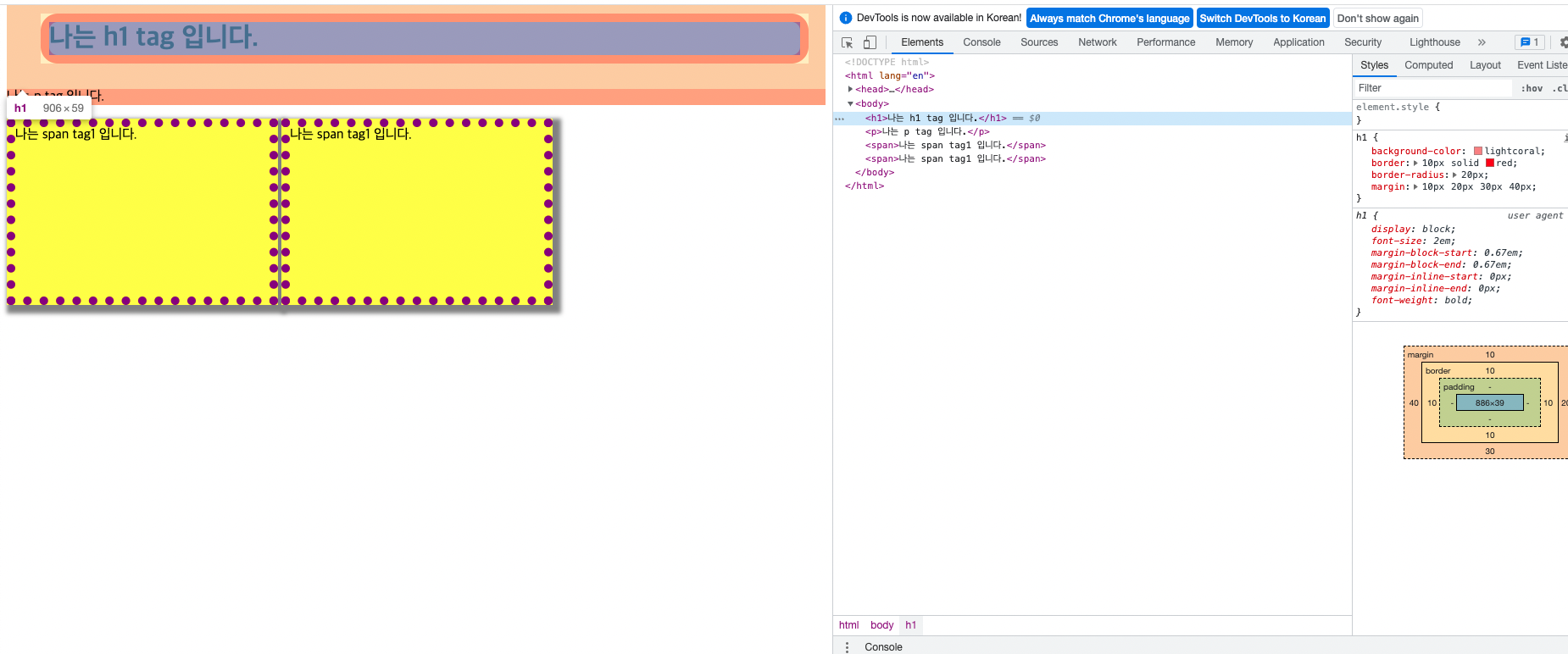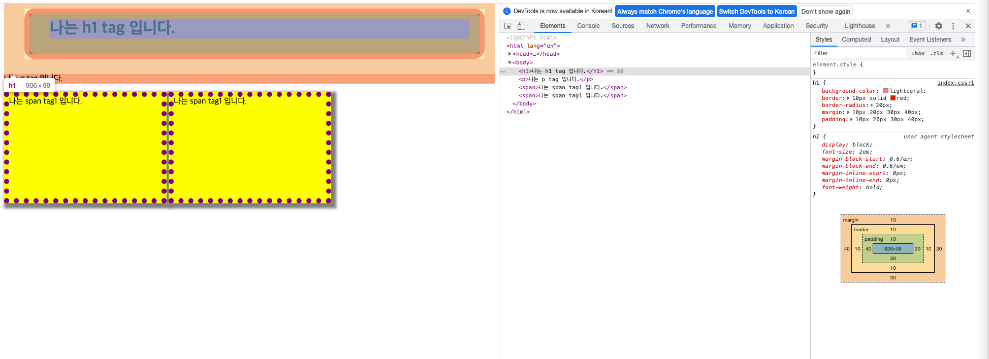 h1 tag 에 border의 빨간 선을을 추가하여 확인해보면 아래와 같이 h1 tag의 테두리를 확인할 수 있다.